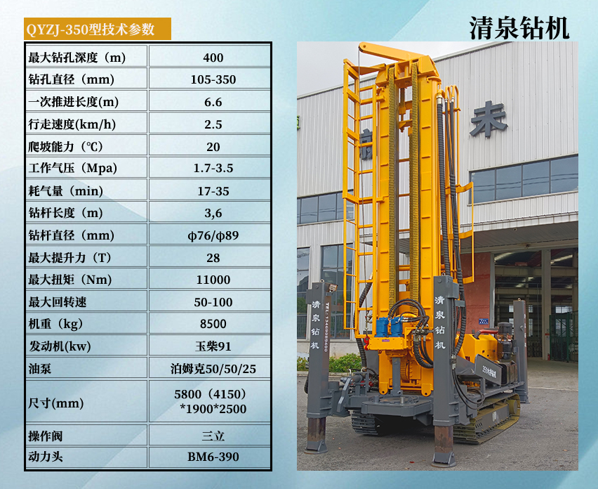 清泉350型潛孔水井鉆機 發(fā)動機功率:玉柴91千瓦。 油泵:美國泊姆克+ 動力頭馬達: BM6-390。 最大扭矩: 11000扭米。 最大提升力: 25噸。 操作閥:三立。 整機機重: 8.5噸。 尺寸:長5.8米(底長4. 15米),寬1.9米,高2. 5米 鉆孔直徑: 105-350 毫米。 鉆桿直徑: φ76/ φ89毫米(3 米)。 一次性推進長度: 6600 毫米。