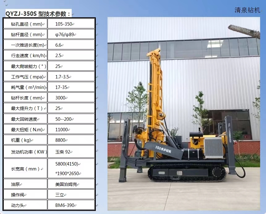 清泉350S型潛孔水井鉆機 發(fā)動機功率:玉柴92千瓦。 油泵:美國泊姆克~ 動力頭馬達: BM6-390。 最大扭矩: 11000扭米。 最大提升力: 25噸。 操作閥:三立。 整機機重: 8.8噸。 尺寸:長5.8米(底長4.15米),寬1.9米,高2. 65米 鉆孔直徑: 105-350 毫米。 鉆桿直徑: φ 76/φ89毫米(3米)